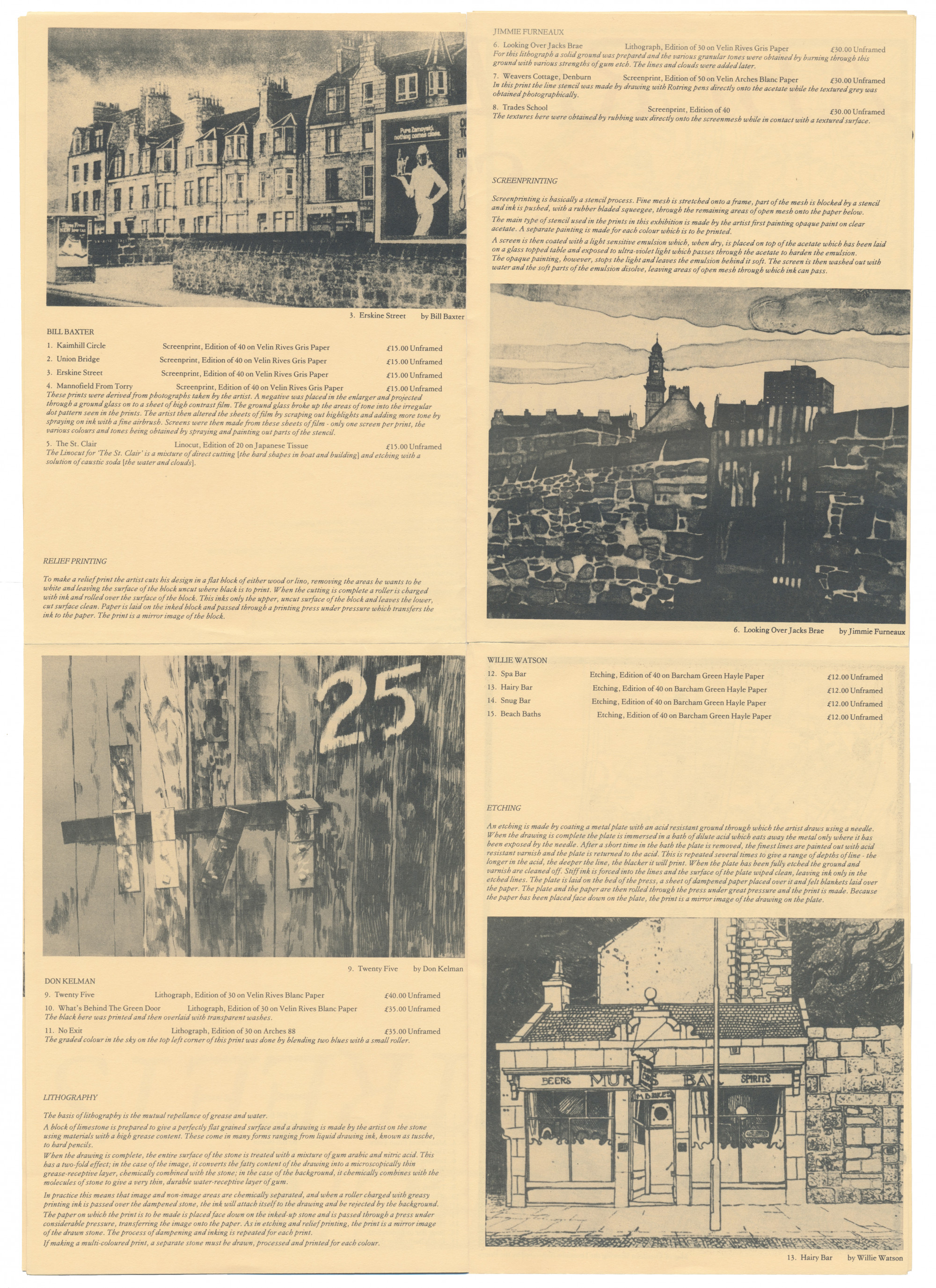 First shown in Artspace Galleries, Belmont Street before a tour of non-art Art venues in the North East of Scotland. The exhibition featured a suite of 15 prints from Bill Baxter, Jimmie Furneaux, Don Kelman and Willie Watson. The catalogue shown here was in the form of a double sided two fold brochure, printed by Aberdeen Peoples Press.