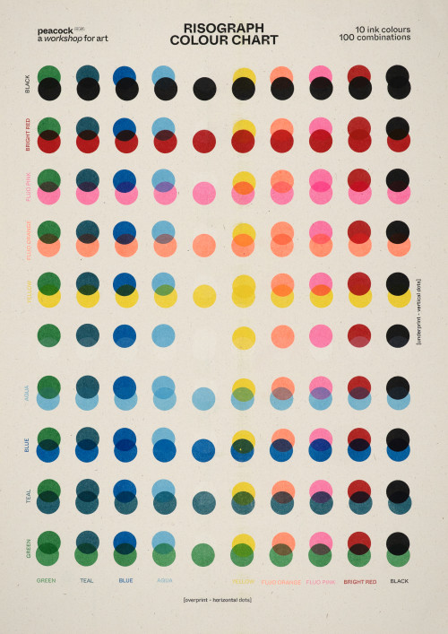 Our Risograph machine is a MZ1070E, can print two colours at once onto paper up to a maximum size of A3 and has interchangeable drums for each colour. There are around 20 official Risograph colours with an array of custom ones available too. We currently have 10 ink colours: Aqua, Black, Blue, Bright Red, Fluorescent Orange, Fluorescent Pink, Green, Teal, White and Yellow. We have over 20 different recycled paper stocks available in various weights and colours. The maximum weight the Risograph can process is 250gsm. Due to the nature of soy-based inks, only uncoated papers can be used for Riso printing; these take a while to dry.