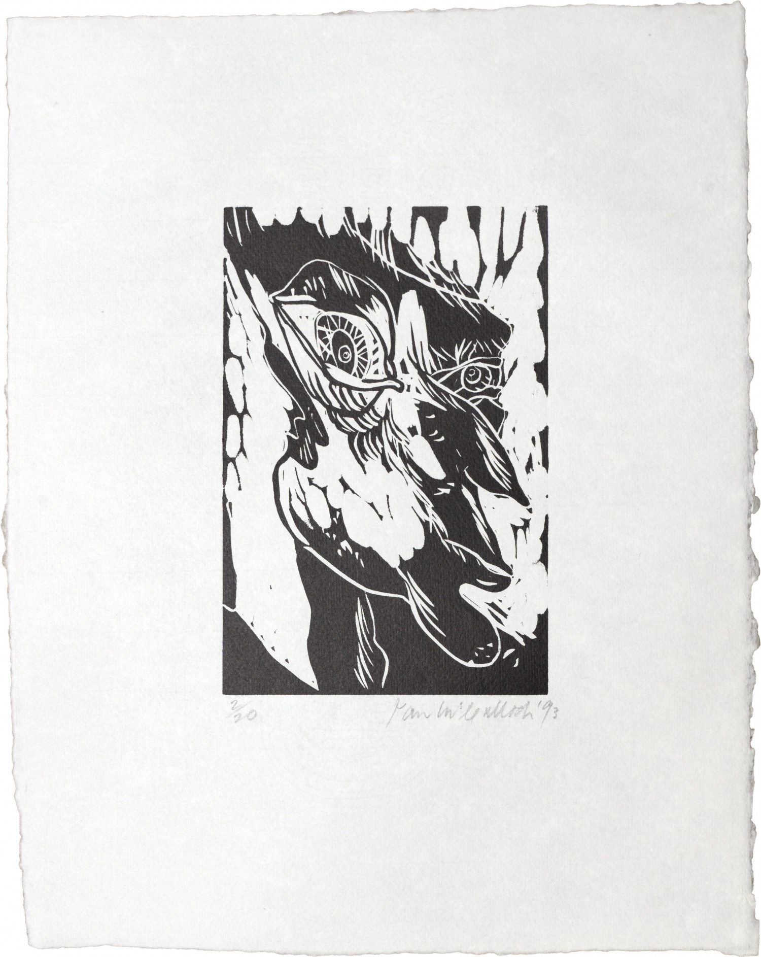 Ian McCulloch is primarily a painter, but has also made prints with all the major Scottish print studios, particularly using the medium of woodcut. McCulloch favours this technique because it allows him the opportunity to use white lines in a way that is difficult to replicate with the same clarity in painting. McCulloch has used this technique to create a series of large-scale woodcuts on mythical themes, a number of which are illustrated in his book The Artist in his World.