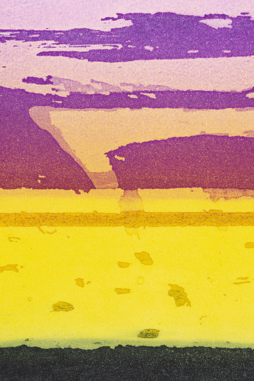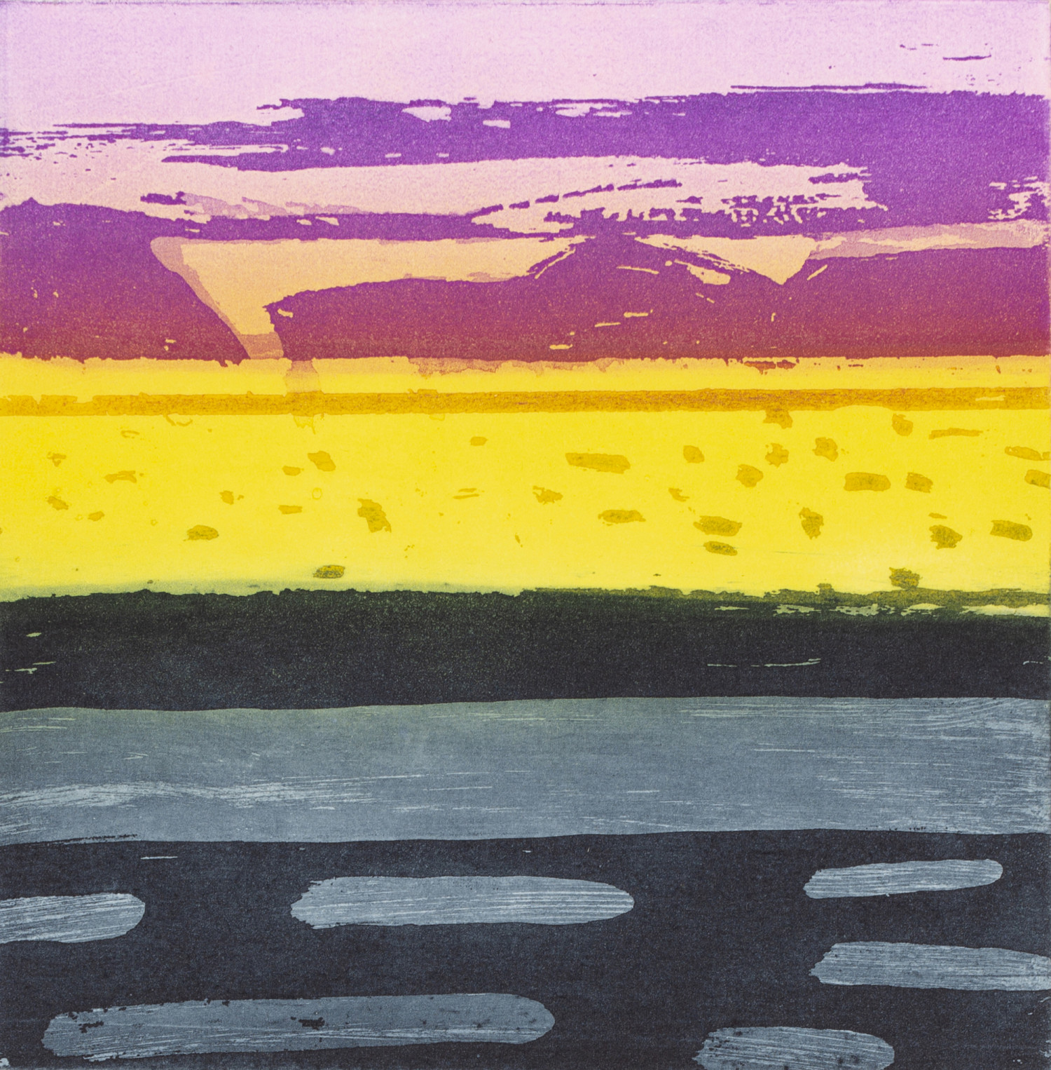 Through the varied use of bold composition, strong contrast and richly textured painted and collaged surfaces Barbara Rae evokes a memorable atmosphere in all her work. At first glance, Rae's paintings seem like planes of abstracted colour, but once your eyes adjust you can make out rural landscapes and industrial architecture. Harbours and coastlines are prominent in her paintings, where rocks become ships, and trees become electricity pylons.