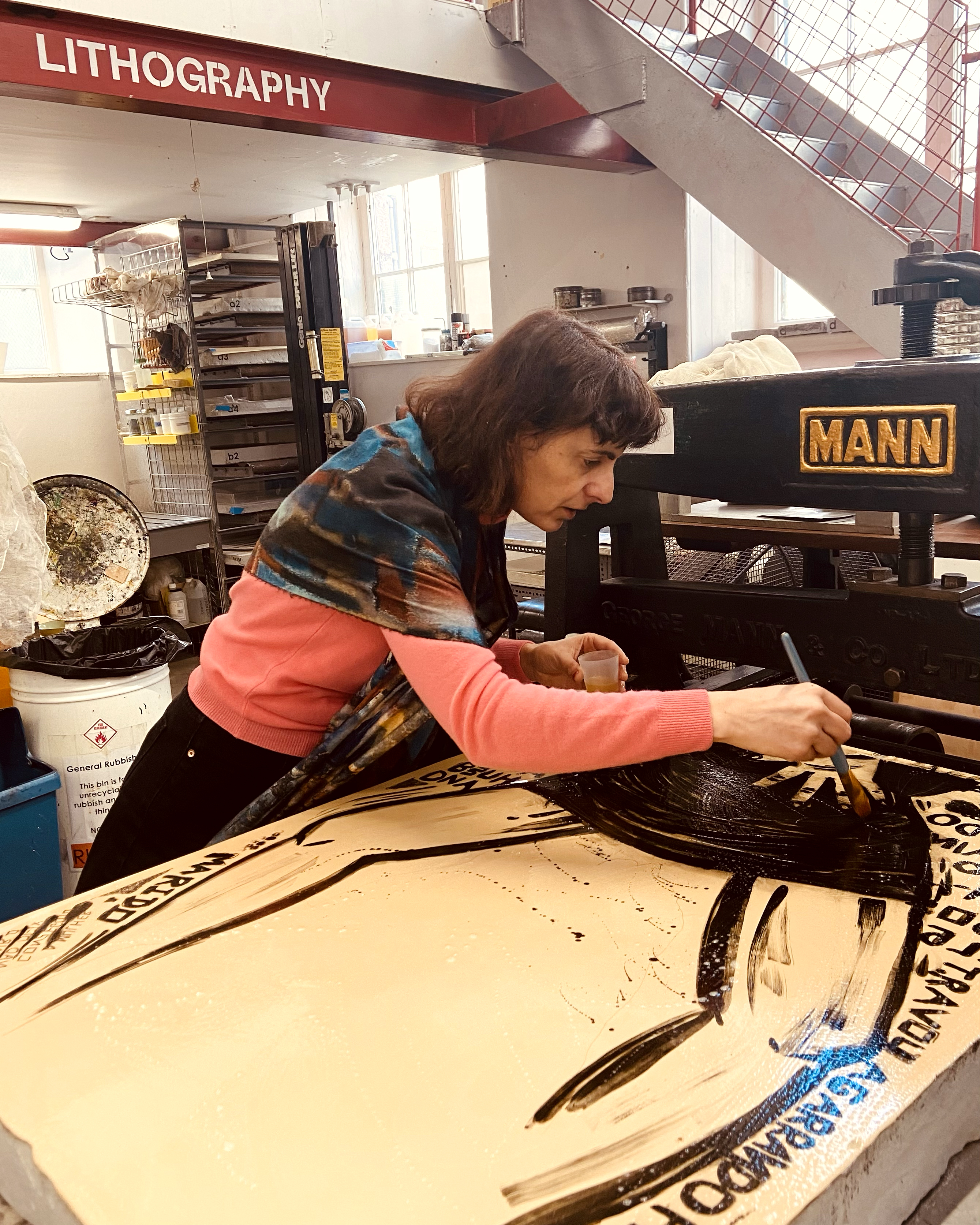 Working in a variety of forms and media, including drawing, printmaking, textiles and installation, she has also produced an extensive catalogue of artist books and publications. Of these, is available in English: ‘An Illustrated Guide to the British Railway to my Study,’ texts and photographs by Carla Filipe, cover texts by Ulrich Loock and Miguel von Hafe Pérez, published in Portuguese and English, edition of 500, published with support from the Fundação Calouste Gulbenkian, 2010. Her most recent work, ‘Poemas oblíquos, binoculares e matinais,’ is an artist book with texts and illustrations by the artist, realised in linocut and letterpress, printed at workshop Edições 50Kg, edition of 50, Porto, Portugal, 2022.