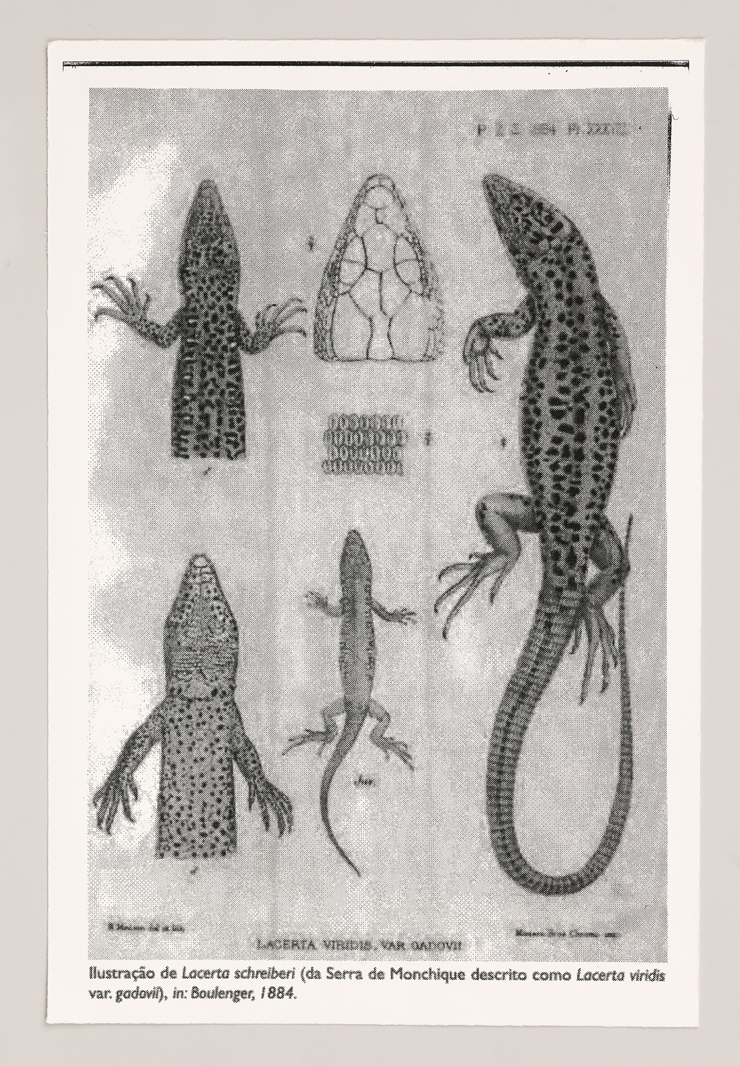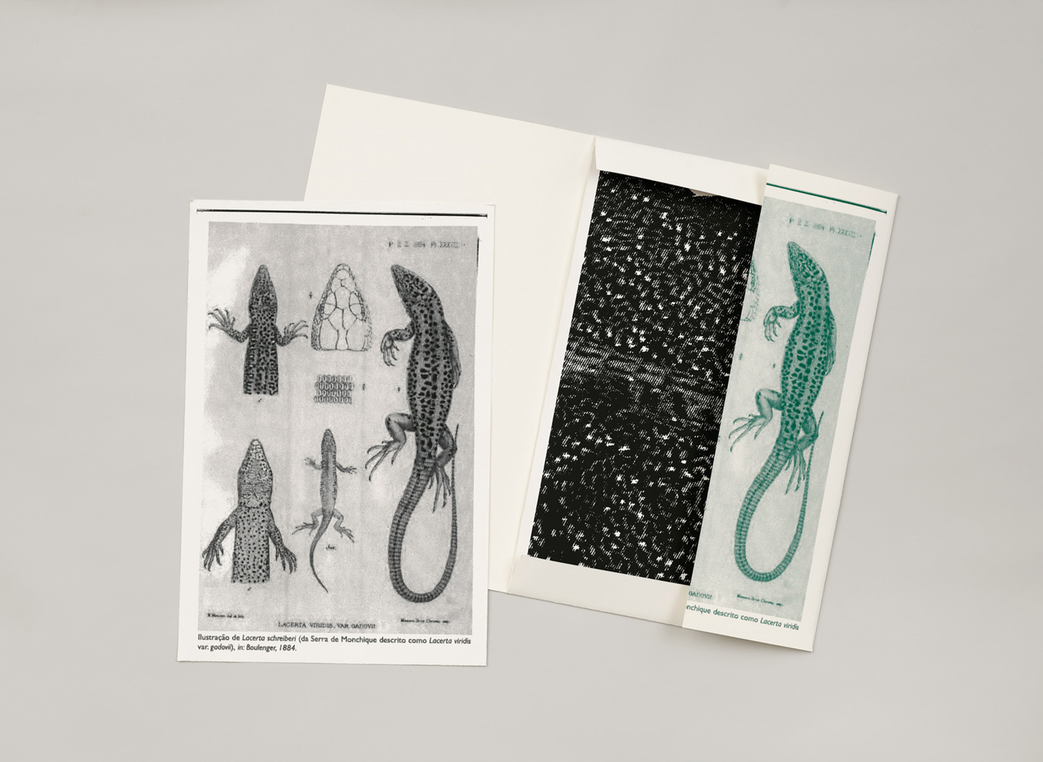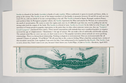 The artist book contains five screenprints, printed by James Vass, representing the abstracted body of the lizard and an illustration. The cover, realised by Jodi Le Bigre, Neil Corall, screenprinted by James Vass, features a text by the artist where she expresses, in her idiosyncratic language, between English and Portuguese, her amalgam of fascination and fear towards the animal.