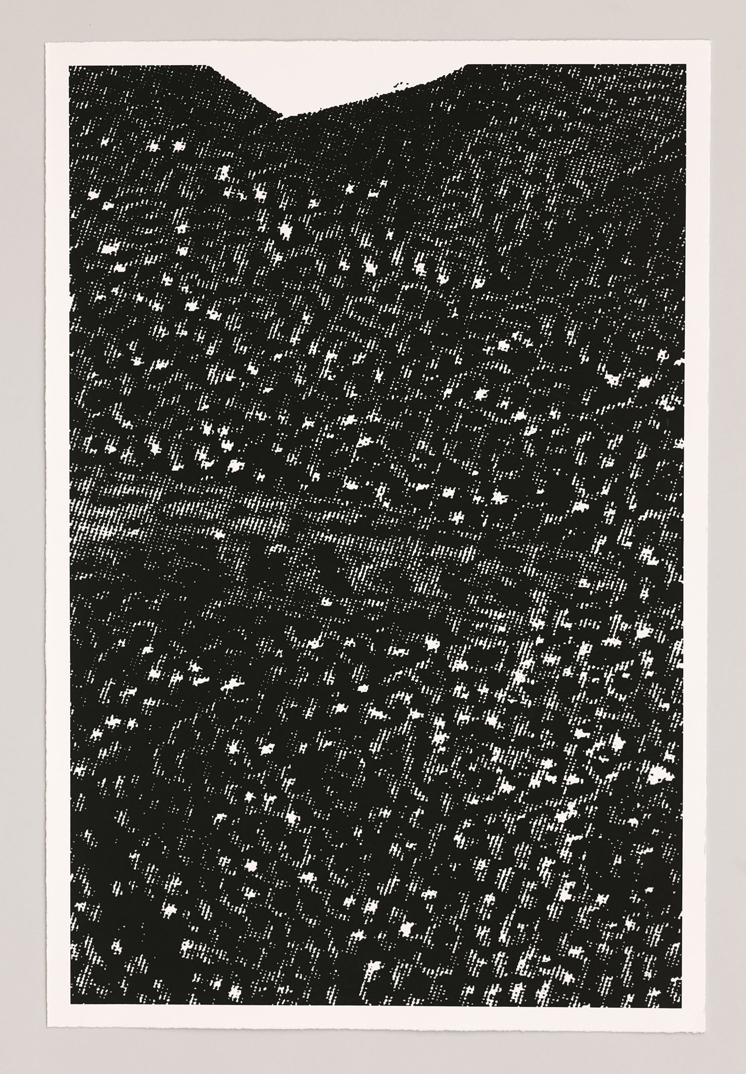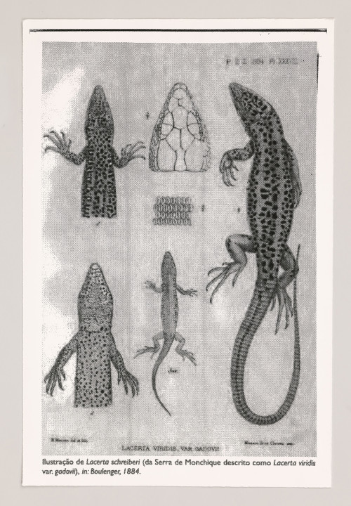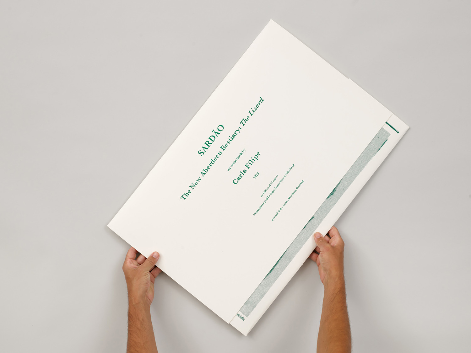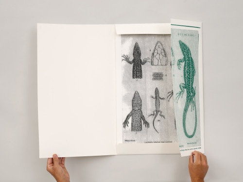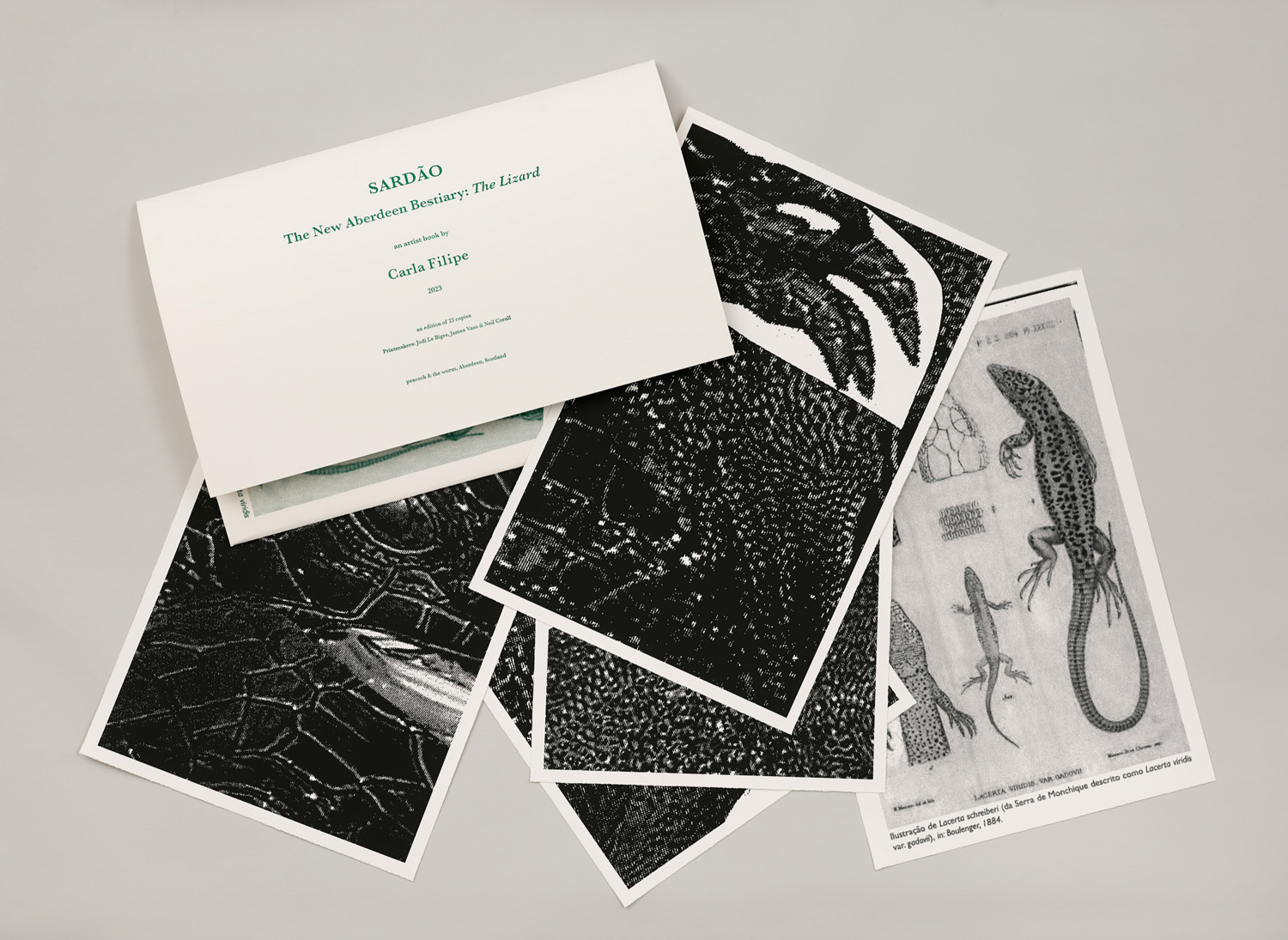 With this artist book, presented as a portfolio of prints, Portuguese artist Carla Filipe analyses a particular type of lizard, known in Portuguese as sardão, which holds her fascination as an animal steeped in folklore and popular culture. The sardão, also known as ocellated or jewelled lizard, can be found across southern Europe, and is connected to a variety of stories and legends that make it an animal feared and revered, particularly by women. In this work, the lizard is abstracted into black and white textures and patterns, and a scientific illustration: an attempt to get to know the animal more closely, perhaps, while also holding it at a safe distance.