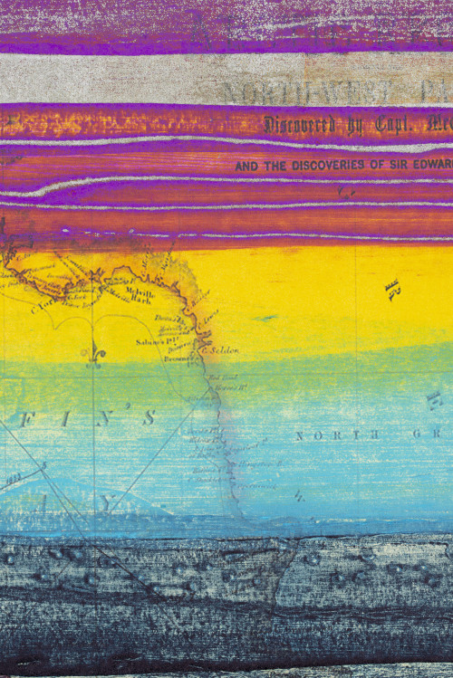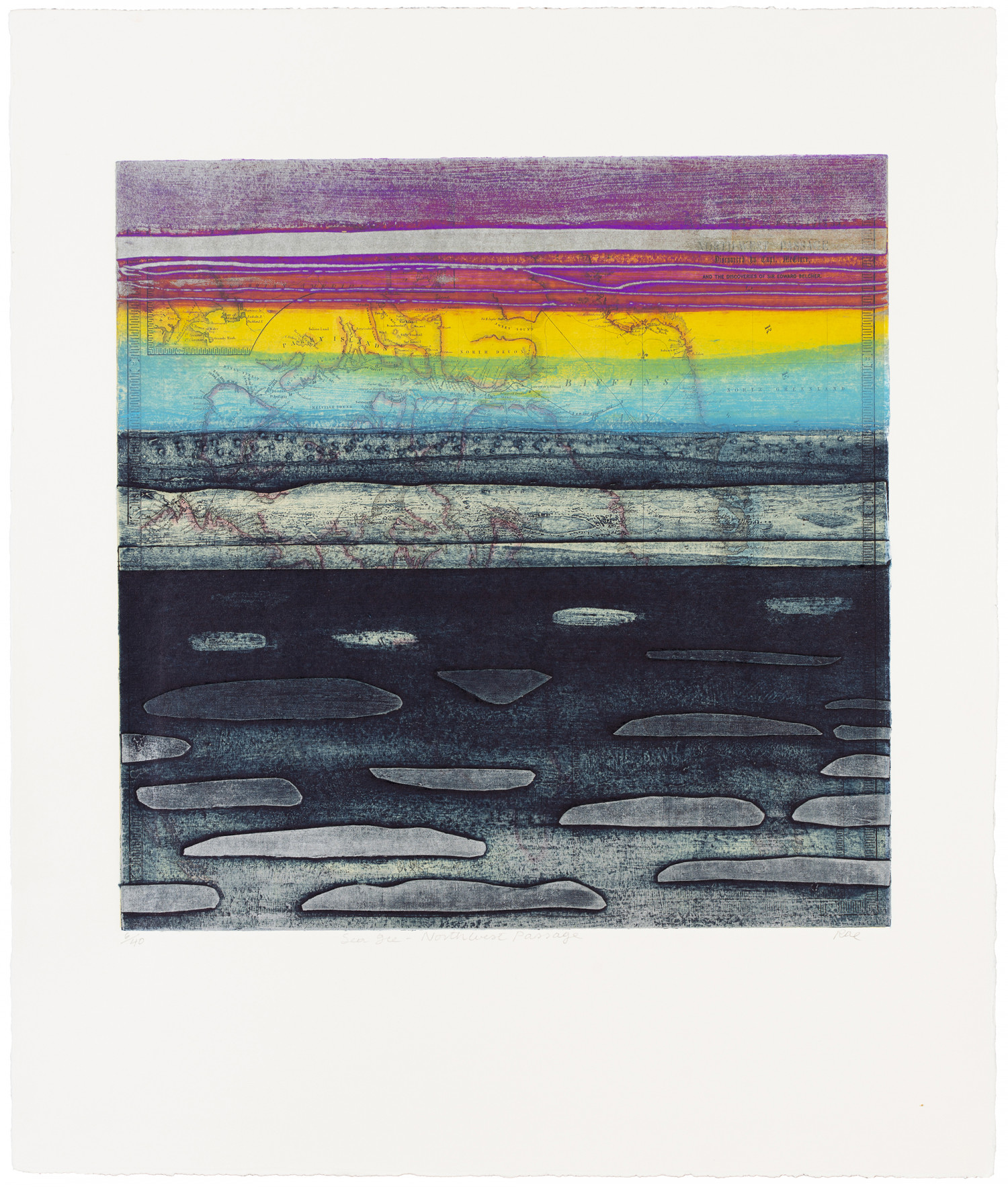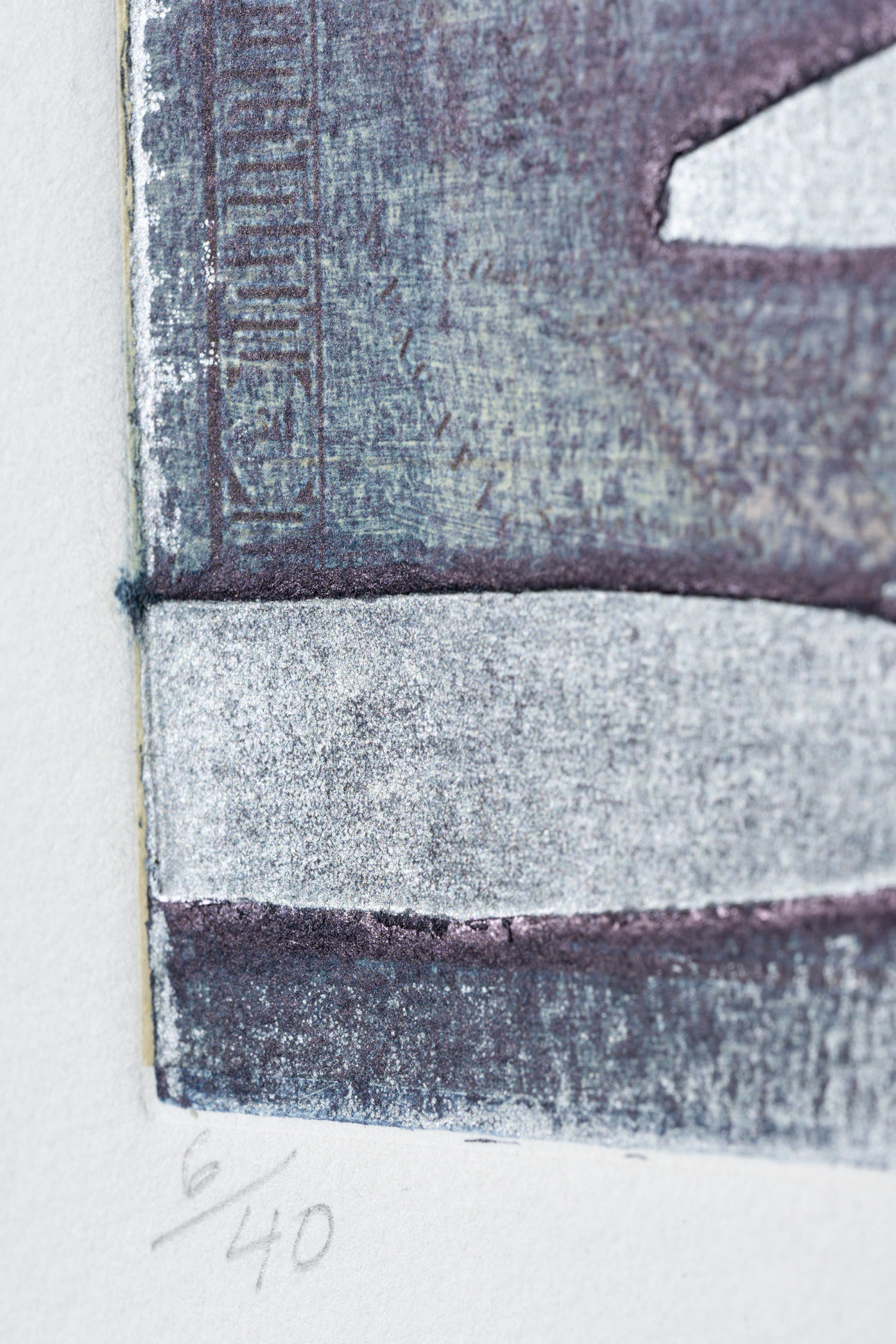 In the order of printing: 1st the blank metal plate to take the Chine-Collé map image. 2nd the relief yellow on the etching plate. 3rd the colours on the Collagraph plate. Firm pressure for the 2 etching plates then light pressure for the Collagraph plate. The glue for the Chine-Collé was a Japanese wheat starch.