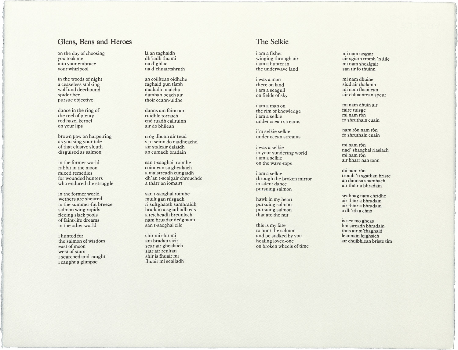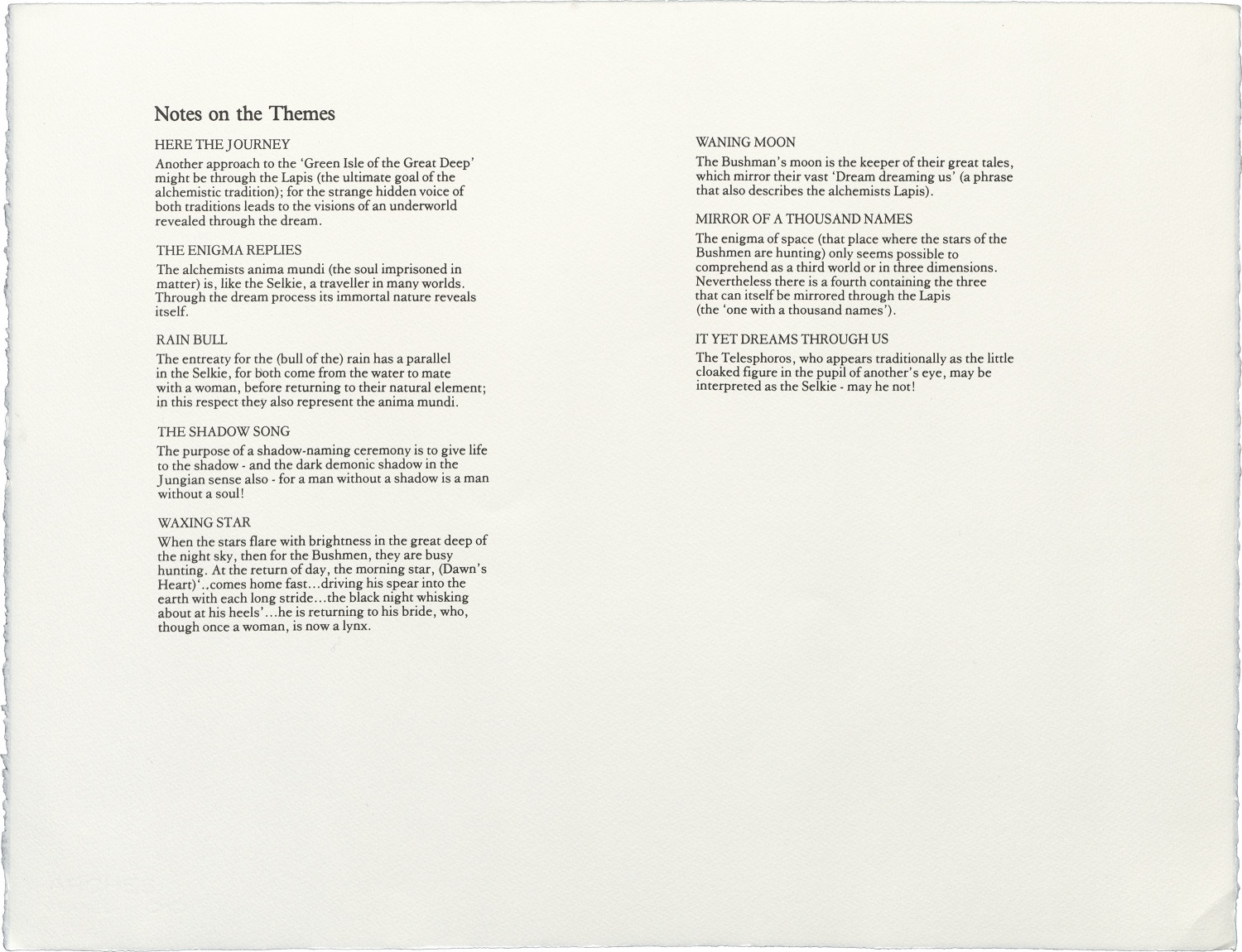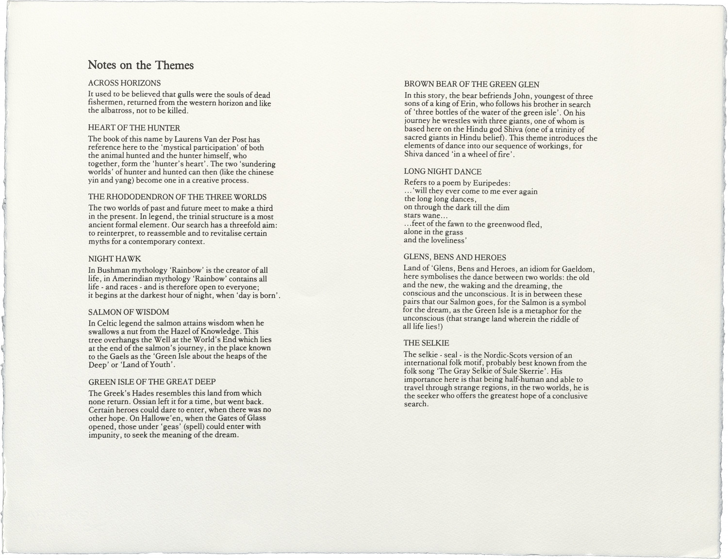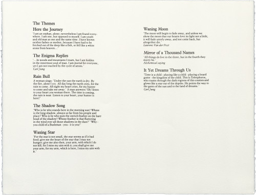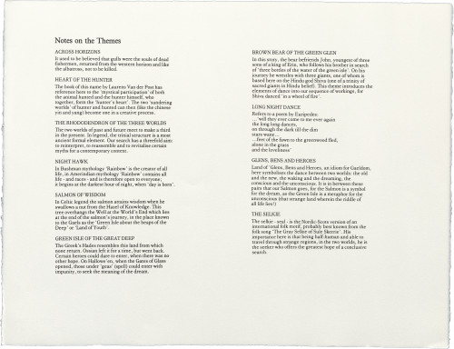 Also in the folio is a poem by Aonghas MacNeacail, which should be read in the context of the visual work. The text of Seeking Wise Salmon is itself also a search: an exploration of themes suggested by Simon Fraser's images. In a second search, the themes developed in Seeking Wise Salmon are responded to in a sequence of visual material with accompanying poetry drawn from two sources: Carl Jung's Memories, Dreams, Reflections (quoted by kind permission of Collins Publishers) and Laurens Van der Post's Heart of the Hunter (quoted by kind permission of the author).