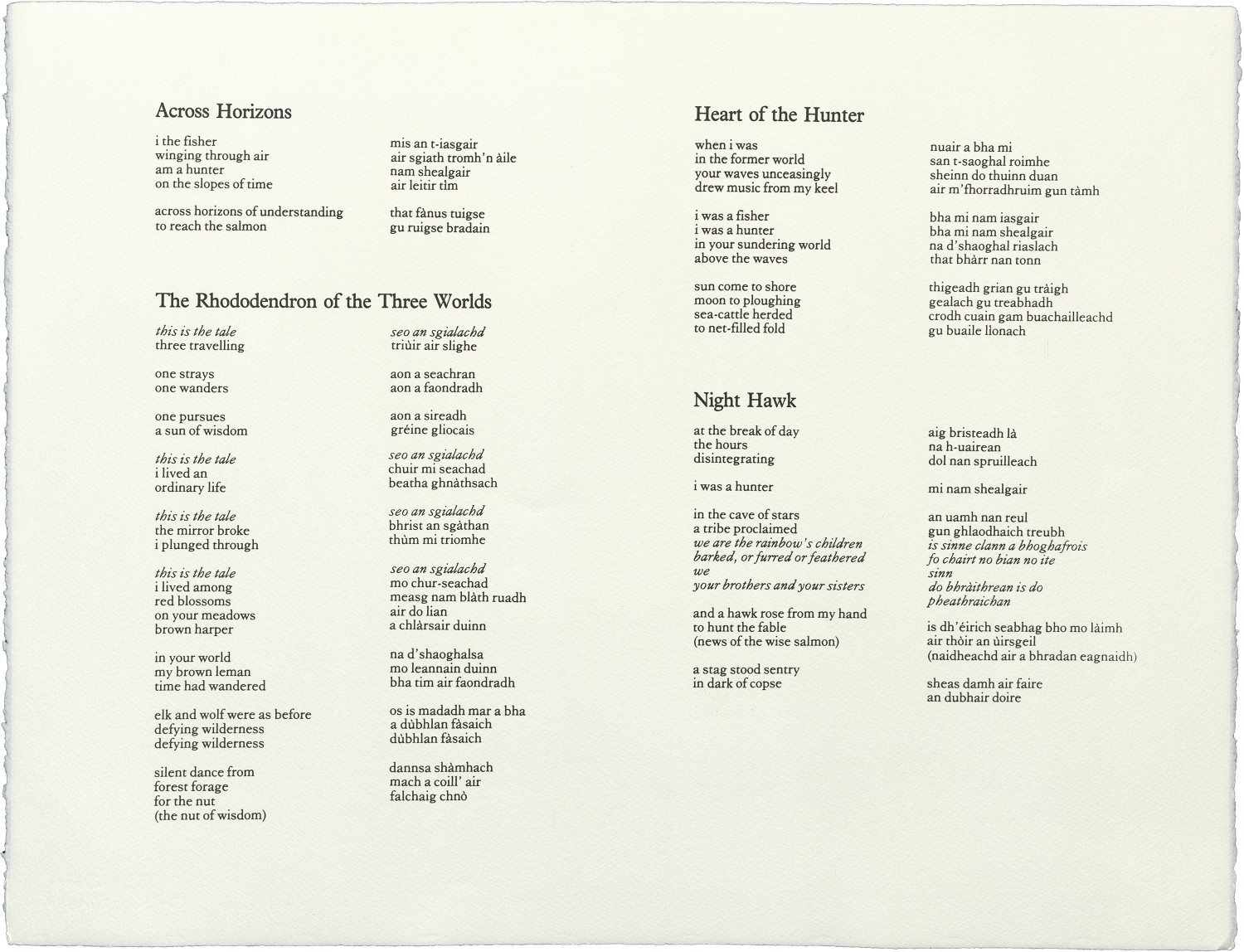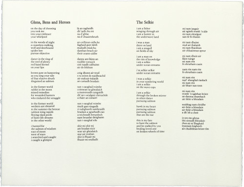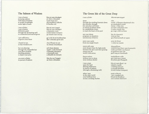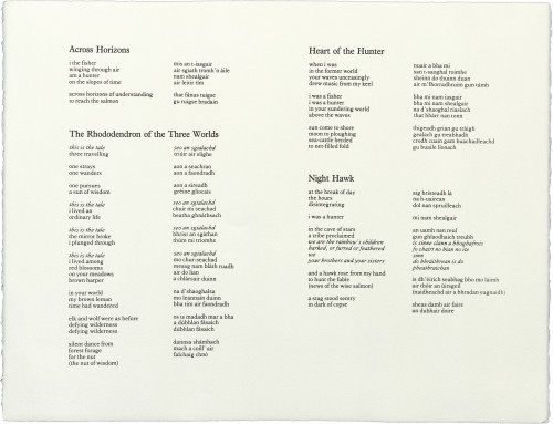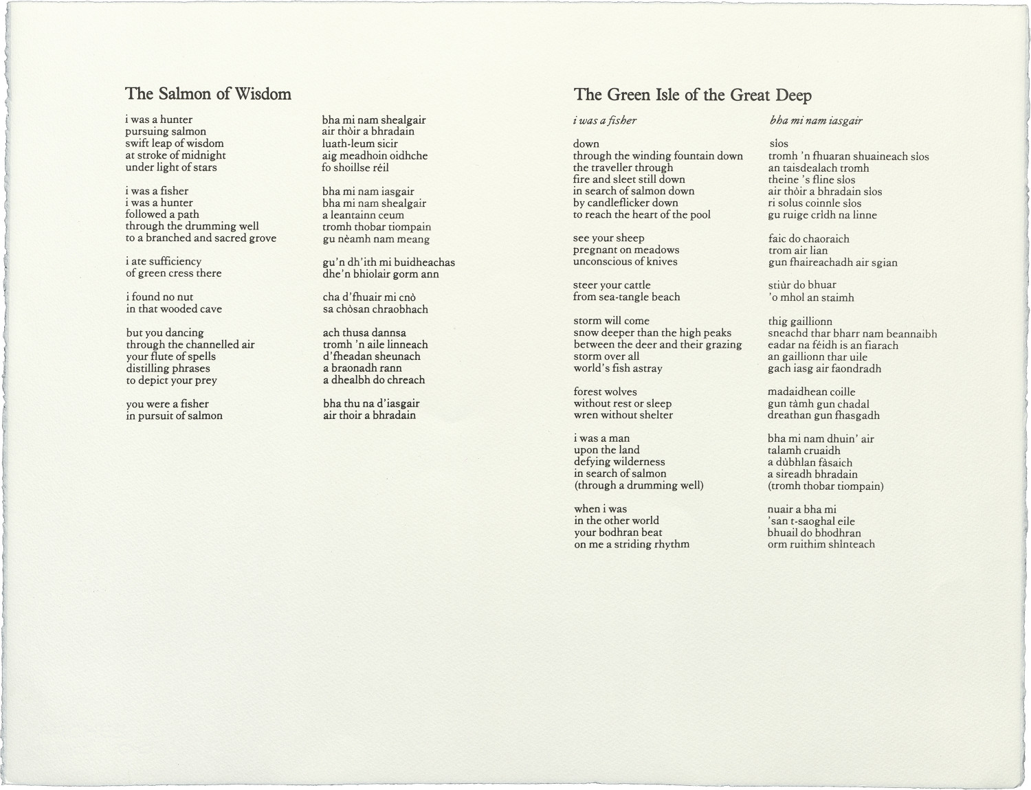 Also in the folio is a poem by Aonghas MacNeacail, which should be read in the context of the visual work. The text of Seeking Wise Salmon is itself also a search: an exploration of themes suggested by Simon Fraser's images. In a second search, the themes developed in Seeking Wise Salmon are responded to in a sequence of visual material with accompanying poetry drawn from two sources: Carl Jung's Memories, Dreams, Reflections (quoted by kind permission of Collins Publishers) and Laurens Van der Post's Heart of the Hunter (quoted by kind permission of the author).