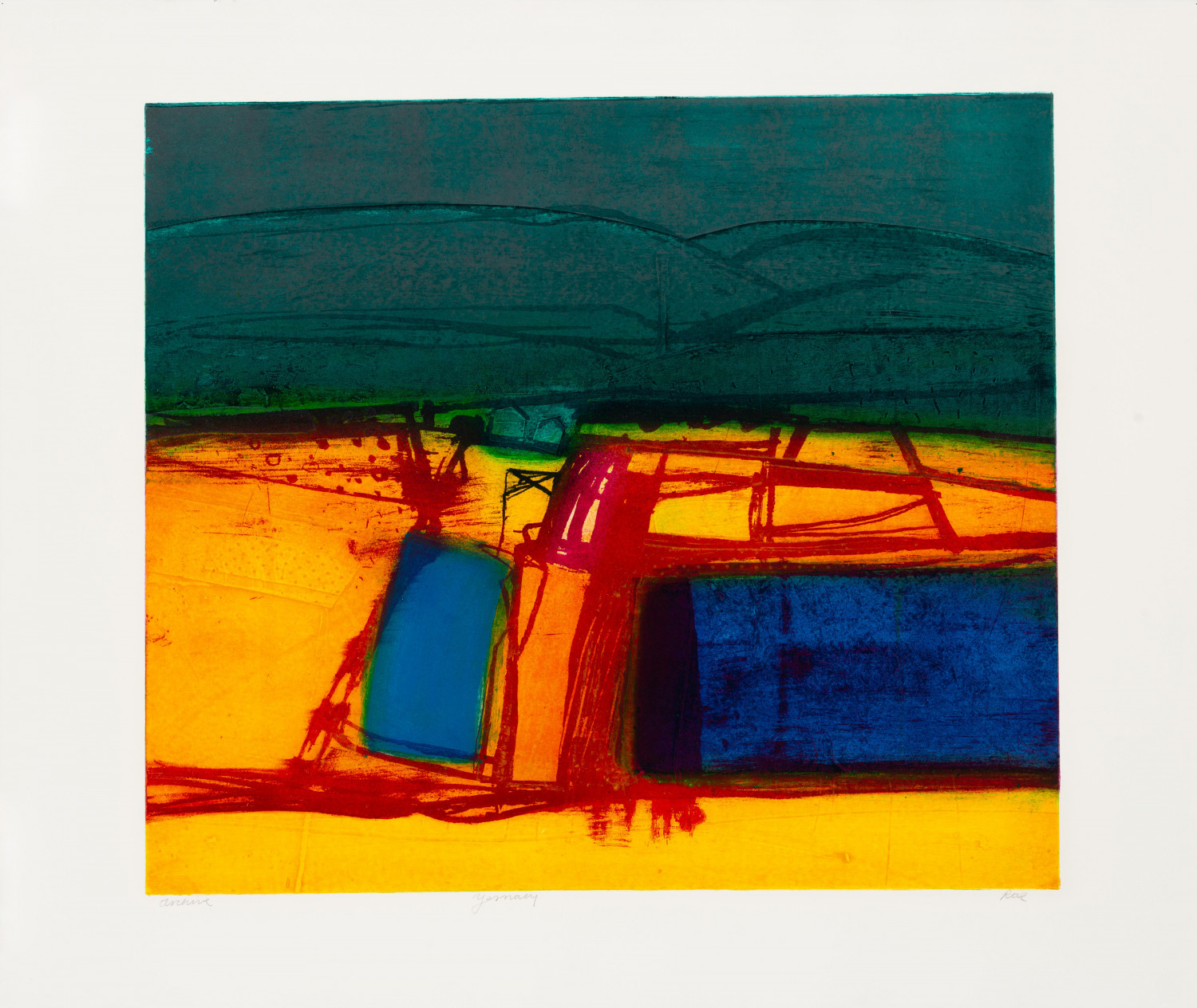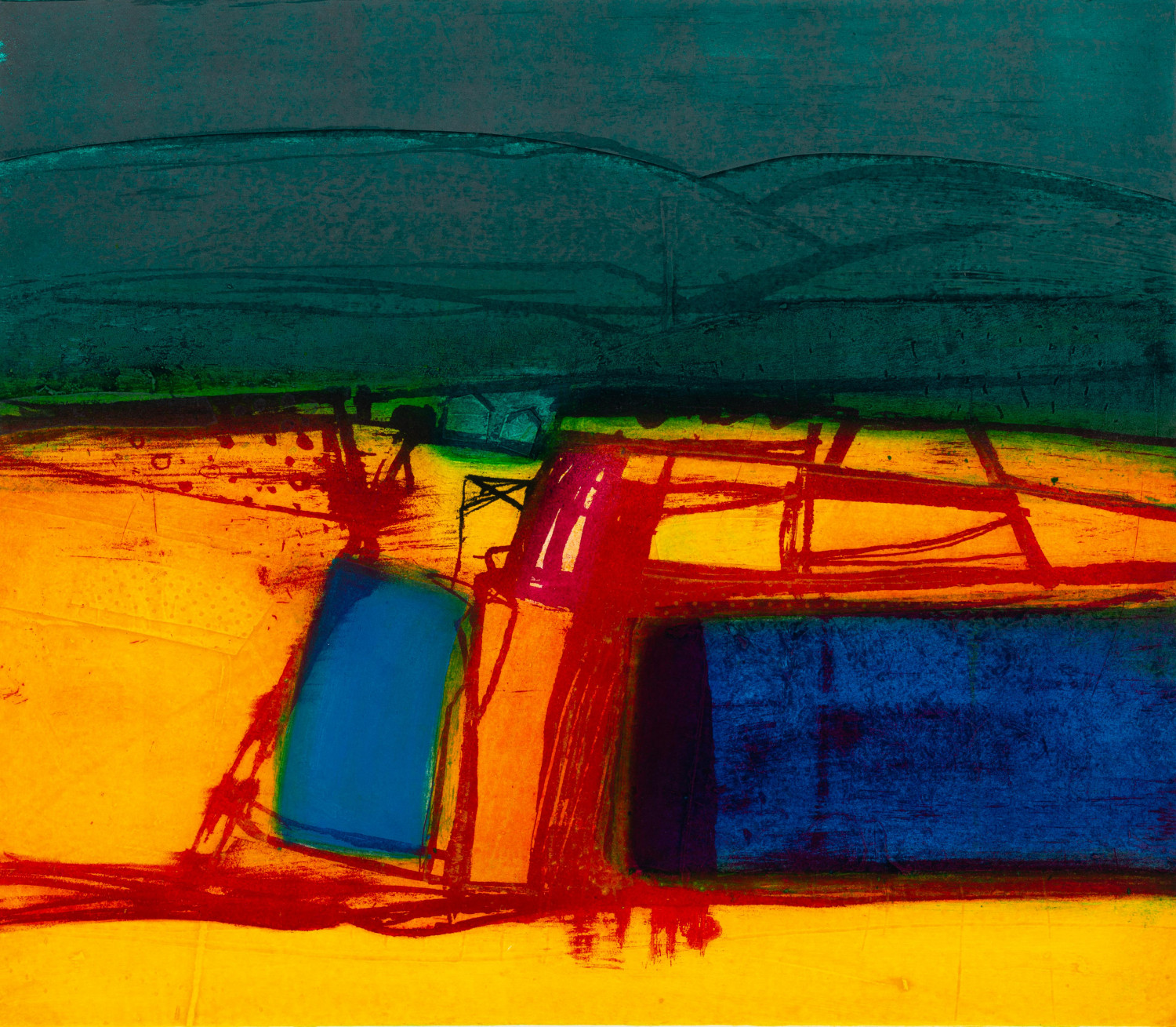 Through the varied use of bold composition, strong contrast and richly textured painted and collaged surfaces Barbara Rae evokes a memorable atmosphere in all her work. At first glance, Rae's paintings seem like planes of abstracted colour, but once your eyes adjust you can make out rural landscapes and industrial architecture. Harbours and coastlines are prominent in her paintings, where rocks become ships, and trees become electricity pylons.