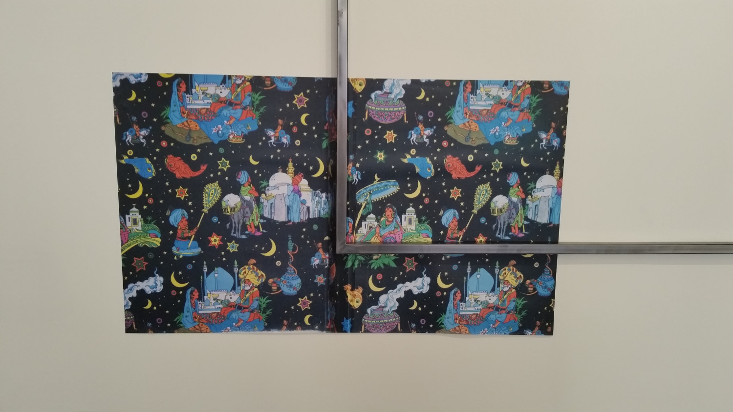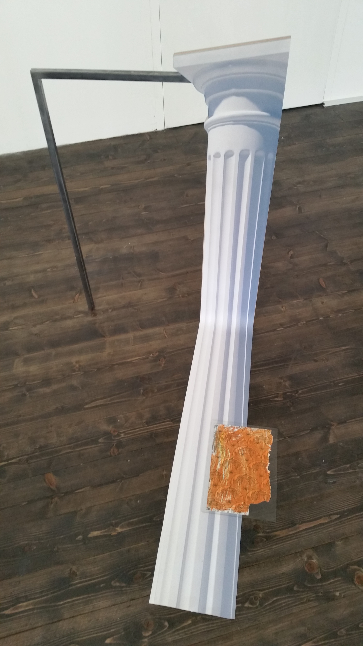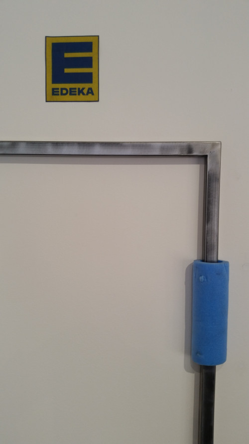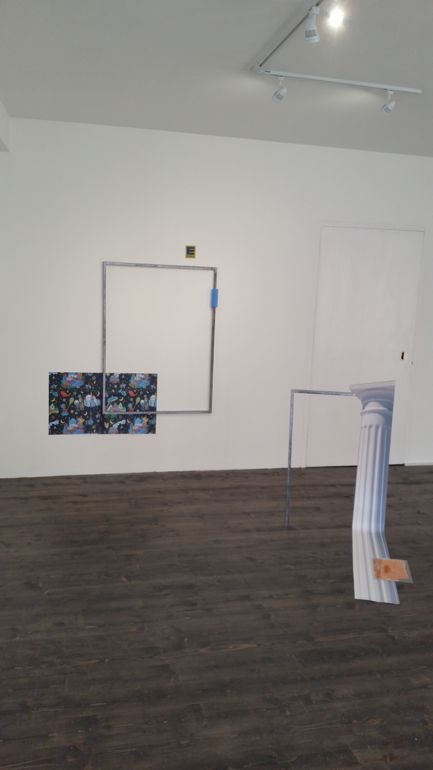 Wachsmuth’s Träume aus Fernost examines manifestations of colonial hierarchies within everyday settings. A colouring book that is (re-)creating stereotypes of a place called “Far East”, defined and determined by the West, is juxtaposed with steel frames, a stand in for a market dominated by Chinese steel production, defining very low market prices to the cost of heavy environmental pollution. A 2D print of a doric column symbolises an ideal of a so called “civilised” and “enlightened” Western aesthetic, which was instrumental in colonising global markets and cultures. Here Wachsmuth refers to digital colonialism as a new form, taking influence from digital reconstructions of Palmyra and further archeological sites under the ethos of “preserving the past protecting the future”, which present Palmyras’ Triumph Arch in prestigious parks and public squares in around the world. Another element reflecting directly on the economical strive of colonialism is the branded E of German supermarket Edeka which is derived from Einkaufsgenossenschaft der Kolonialwarenhändler (wholesale cooperative of colonial grocers) - abbreviated to E. d. K.