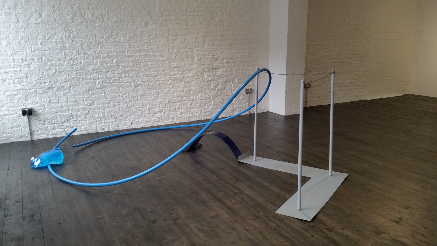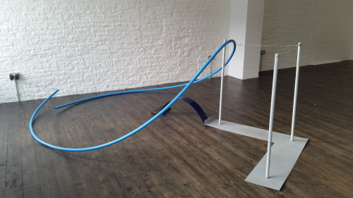 Familiar environments and imagery are tackled within the practices of Cassia Dodman and Anna Wachsmuth, where both investigate aspects of objects and structures that are common within their immediate locations. Dodman presents a large sculptural installation which initiates various barriers, boundaries, and containers. Agitating the Cusp has been influenced by the structures and systems that occupy rural agricultural space - dividing, designating and bypassing land and material - such as electric fences, pools of water, underground plumbing pipes and crossing stiles. These are translated into the exhibition space, carrying over their unspoken limits and connotations of controlled navigation and applying it to an audience, whether functionally or through association. Materials are charged, exchanging a subversive energy; their fluxed state is maintained in a delicate equilibrium between suspense and action, the collapse of which is both a disruptive and a compelling outcome.