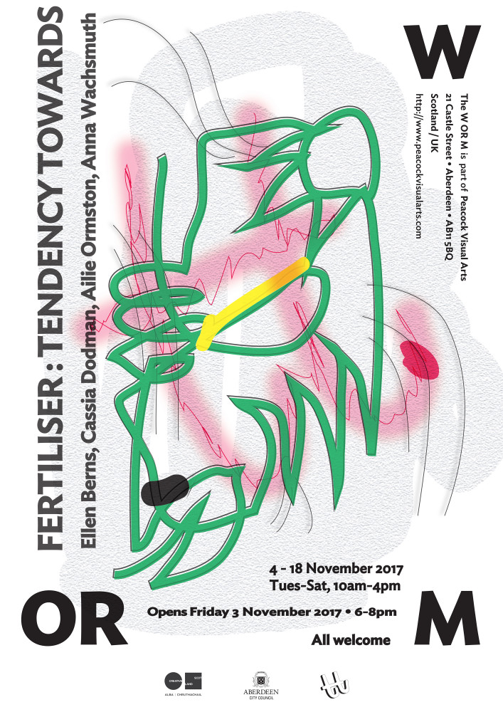 Peacock Visual Arts presents Fertiliser, a group exhibition at The W OR M of recent Scottish Art School graduates that brings together newly commissioned artworks by artists Ellen Berns, Cassia Dodman, Ailie Ormston and Anna Wachsmuth.