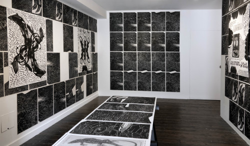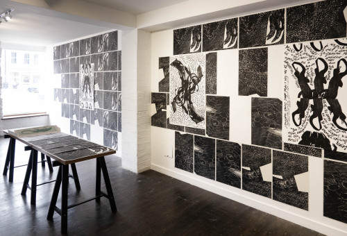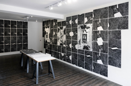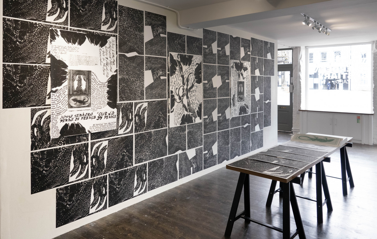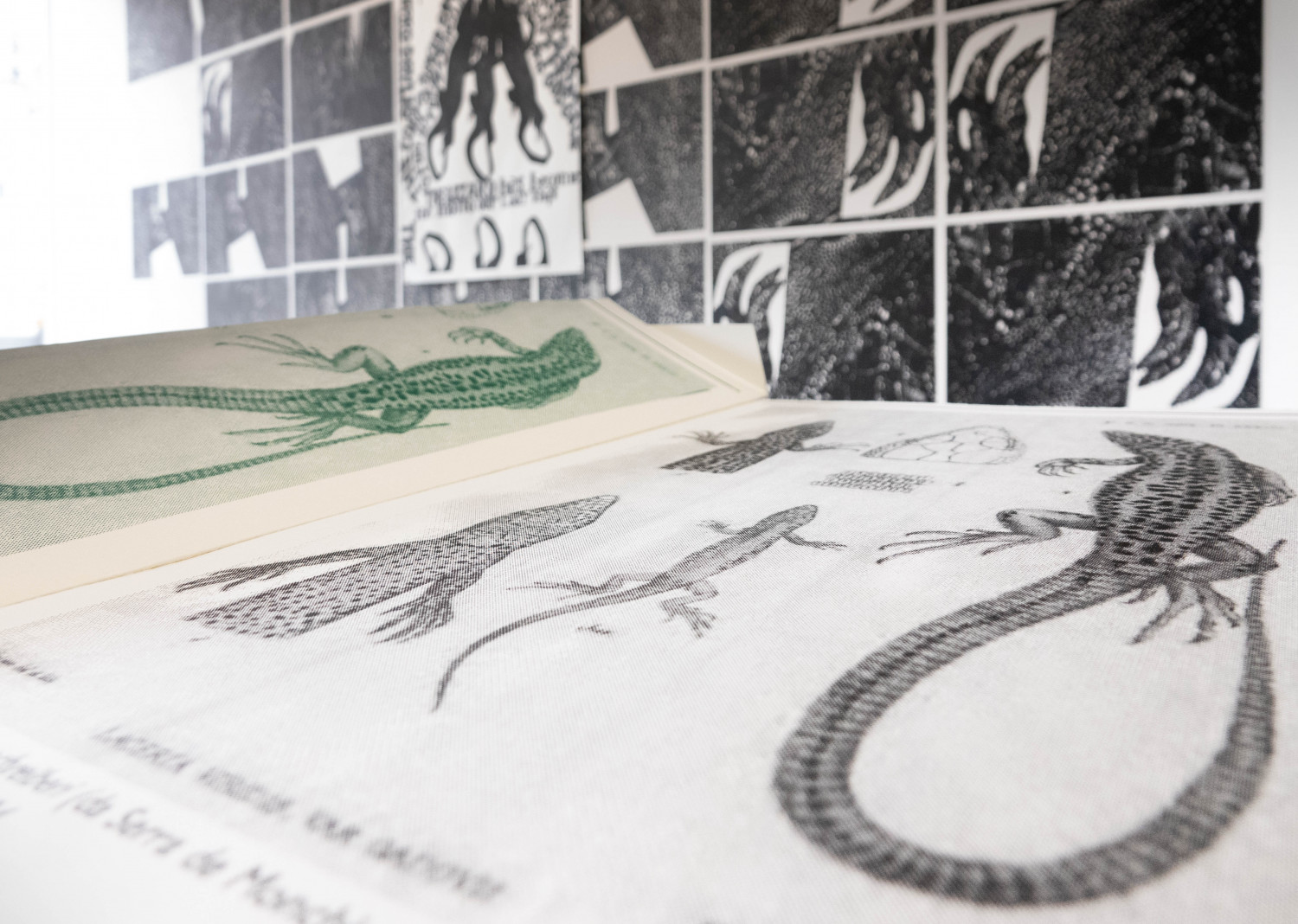 The space of the gallery is covered by over 100 hand-printed black and white wallpaper tiles depicting reptilian eyes and skin, resembling constellations. Arranged on top of those, there are six prints, completed by handwritten text. In addition, there is also an artist’s book, a publication carrying several aspects of the exhibition: a text about the sardão, the reptilian eyes and skin that cover the walls, a scientific drawing of the animal, and a folded relief-printed cover holding these materials. With the artist book, Carla’s intention is to make an affordable fine art publication that will outlive the exhibition.