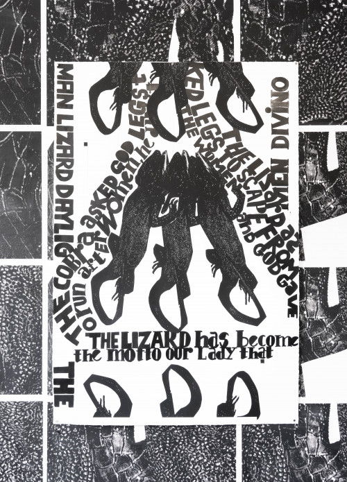 The Lizard is the fourth exhibition in the New Aberdeen Bestiary, showcasing work by Portuguese artist Carla Filipe, realised in collaboration with printmakers Neil Corall, Jodi Le Bigre and James Vass. The exhibition explores popular lore surrounding the sardão, a species of lizard.