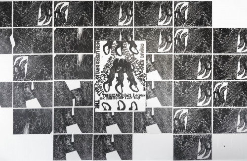 Symbolising women and men respectively, the snake and the lizard stand as complementary opposites. The relation of unity and opposition between dualities is crucial to The Lizard.' As the lizard is abstracted into its constitutive elements, into fragments of skin and eye, it could also be seen as a snake; the two morph into each other as if by a trick of the eye. Carla Filipe’s proposition in The Lizard reframes language in terms of form and meaning, creating an idiosyncratic idiom with a strong written narrative and a self-reflective element. This is visible in the intertwined use of two languages, Portuguese and English, and the use of handwriting on top of print.