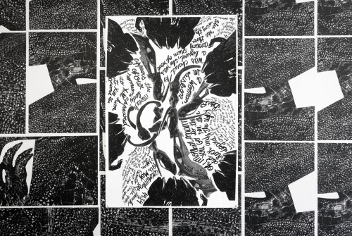 The works in the exhibition reflect the artist’s disquiet, her disdain for accepted and ‘proper’ ways of doing. During her residency, Carla worked across a variety of printmaking techniques, from lithography to relief printing and screenprinting. The works employ a variety of papers, from fine printmaking paper to newsprint, under the guidance of our printmakers but remaining very physically involved in the composition of the works. Her way of composing prints is organic, decided on the fly, then finished by hand, developing several linguistic and calligraphic quirks in the process. The results of her rule breaking are irreverent and indomitable images, often resorting to humour.