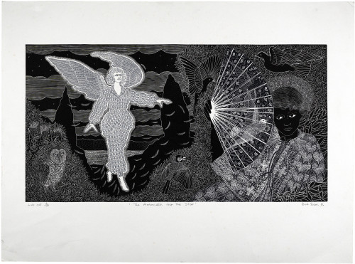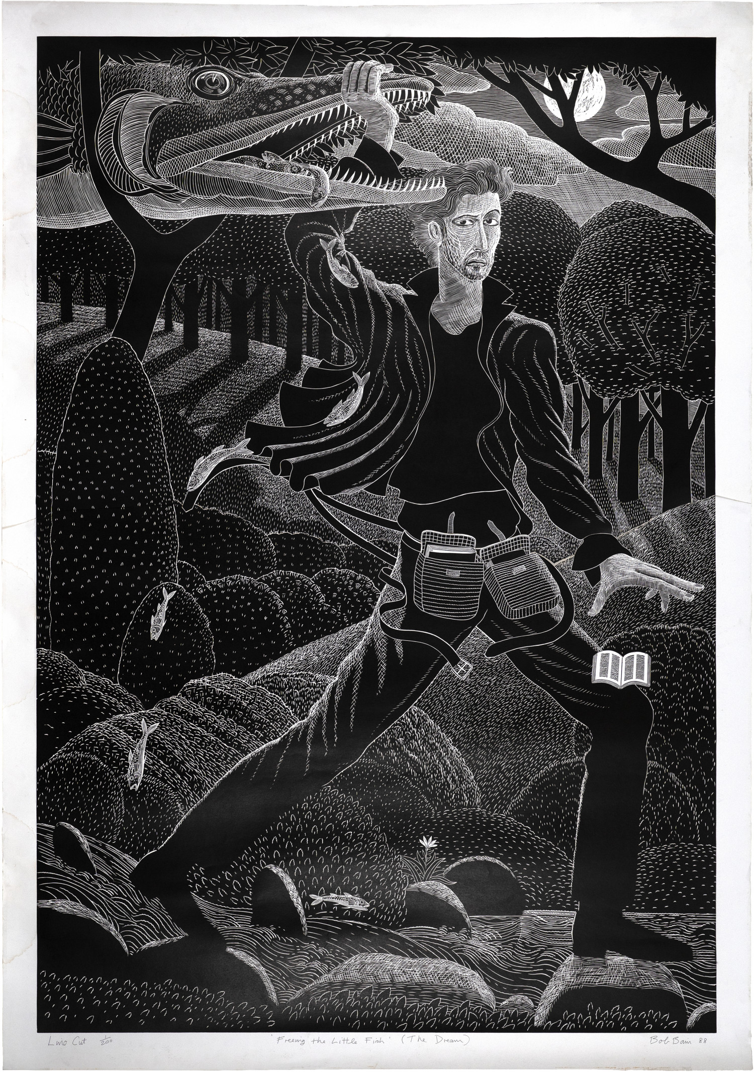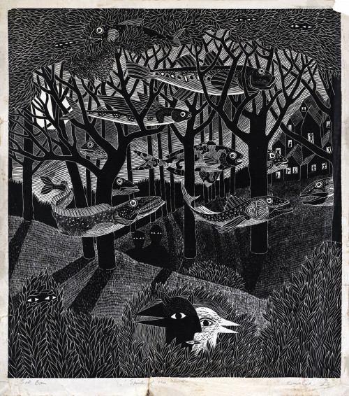 The print which was to define Bob Bain’s mature style was his linocut Spirits of the Wood where enormous fish swim through the treetops and the only human presence is the eyes peering through the undergrowth. The cutting is assured, the printing precise and the image arresting. It was first exhibited in the Royal Scottish Academy summer exhibition. There was an undoubted nod to surrealism, perhaps Rene Magritte, and this would continue through later works.