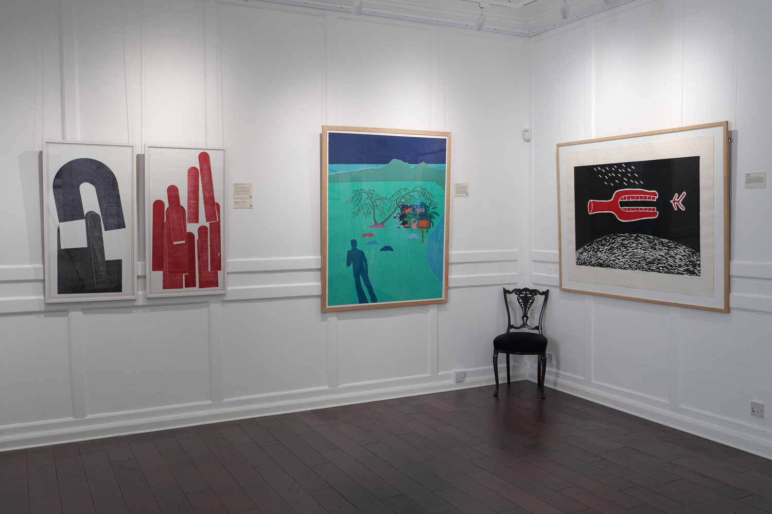 Some rooms elicit curious conversations between artists working in the same medium but with completely different styles. In the room dedicated to relief prints, Tom Hammick’s reduction woodcuts from the Lunar Voyage series are an eerie, melancholic representation of interstellar travel, while Doug Cocker’s visions of outer space border on the nightmarish and the surreal. In screenprinting, Frances Walker’s meditative, personal view of an Antarctic coastal landscape sits alongside Marie Velardi’s poignant yet subtle call for attention to the risks of human intervention on shorelines.