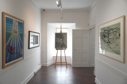 Places and portraits populate the etching room, ranging from Donald Urquhart’s sleek black and white celebrity portraits to Joyce Cairns’ lyrical narrative of Aberdeen’s Footdee. Some of the works, such as Dawson Murray or Adam Bridgeland’s prints, celebrate the serendipity of artmaking, embracing the unexpected diversions and pathways that can spring up from a dynamic, energetic workplace.