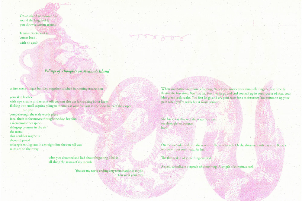 As part of the latest New Aberdeen Bestiary exhibition, The Snake by Delaine Le Bas, peacock & the worm is hosting a writing and printmaking workshop facilitated by multi-disciplinary artist Yvette Bathgate. The workshop will carry on the themes and concerns of the exhibition, exploring the figure of Medusa, hybridity, language, and the relation between the animal and the human. The workshop will offer an experimental, interdisciplinary approach to writing and printmaking, combining different mediums and techniques.