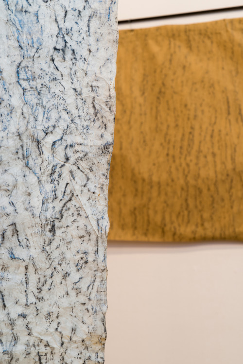 The large sculptural hanging drawings are tree portraits, but portraits more ‘with’ than ‘of’ the tree. Each one is made by encasing a section of tree in my chosen paper, and then making a rubbing of the bark with graphite. This is making that requires touch, literally rubbing up against a place – thus a meeting of bodies, a co-production. There is an indexical relationship between the drawing and the tree, which I think is stronger than that of a photograph. These rubbed marks are made by the tree in physical contact with the paper, my body, and the graphite. The tree and me meet here on this paper. What is produced by that meeting is the artwork, but also a transformation of our relationship. The tree becomes individuated, personified. As my project carries on into the future, my aim is to rub each species of tree in the wood (I have counted twenty-three so far) but the trees are approached as individuals, and acknowledged as co-creators of the piece.
