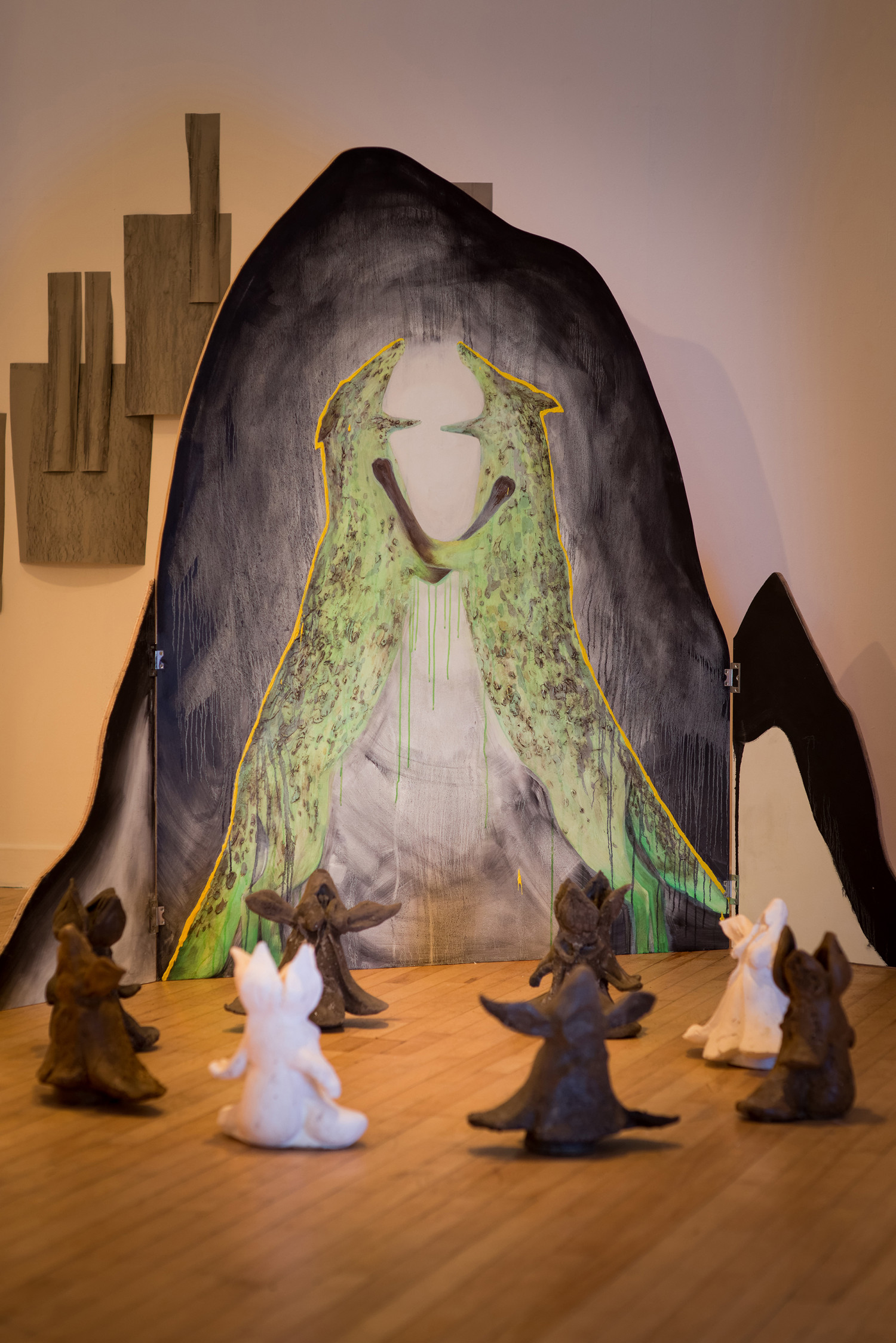 The hinged painting Vixen Fight elaborates an event that happened last summer, when foxy screeching made me investigate up the hill, to see two foxes starting at me somewhat guiltily, luminous in the torchlight, eyes ghostlike and shining. I had been reading a book about foxes, which described a fight between two vixens in the mating season. In my imagination, these two instances coalesced.
