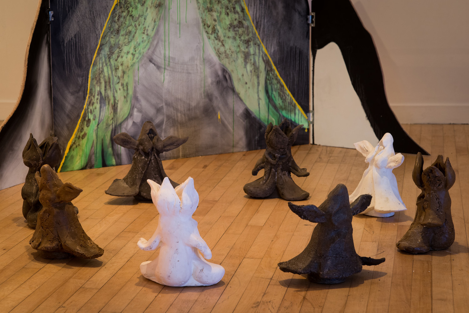 Tucked in and around the ‘trees’ in this show are responses to lots of other aspects and beings that populate these particular woods. There is a ring of sculptures that look something like dancing figures. The shapes of these sculptures are derived from woodland flower petals, one from the Common Spotted Orchid, and the other from one petule of the conical Bugle, both of which species are relatively common in the chalk-hills of the Kent Downs. Each shape is made from four colours, because they are cast in the four soils types I have dug up from the woods (Kent has a notoriously complex geology, having intricate layers of sedimentary rocks and soils laid down by successive river basins and shallow seas) Each of my soils was dug out and made visible by an animal – the yellowish sand and the ashy grey were both from rabbit burrows, the white chalk from a badger sett and the brown mud from a molehill. I am not sure where the ash came from, but I do know that during World War Two, these woods were heavily used by the army, and I find metalwork (billy cans and the like) that date from this time lying about, and even one shattered shell casing still sits grimly among the bluebells. There are lots of craters as well.