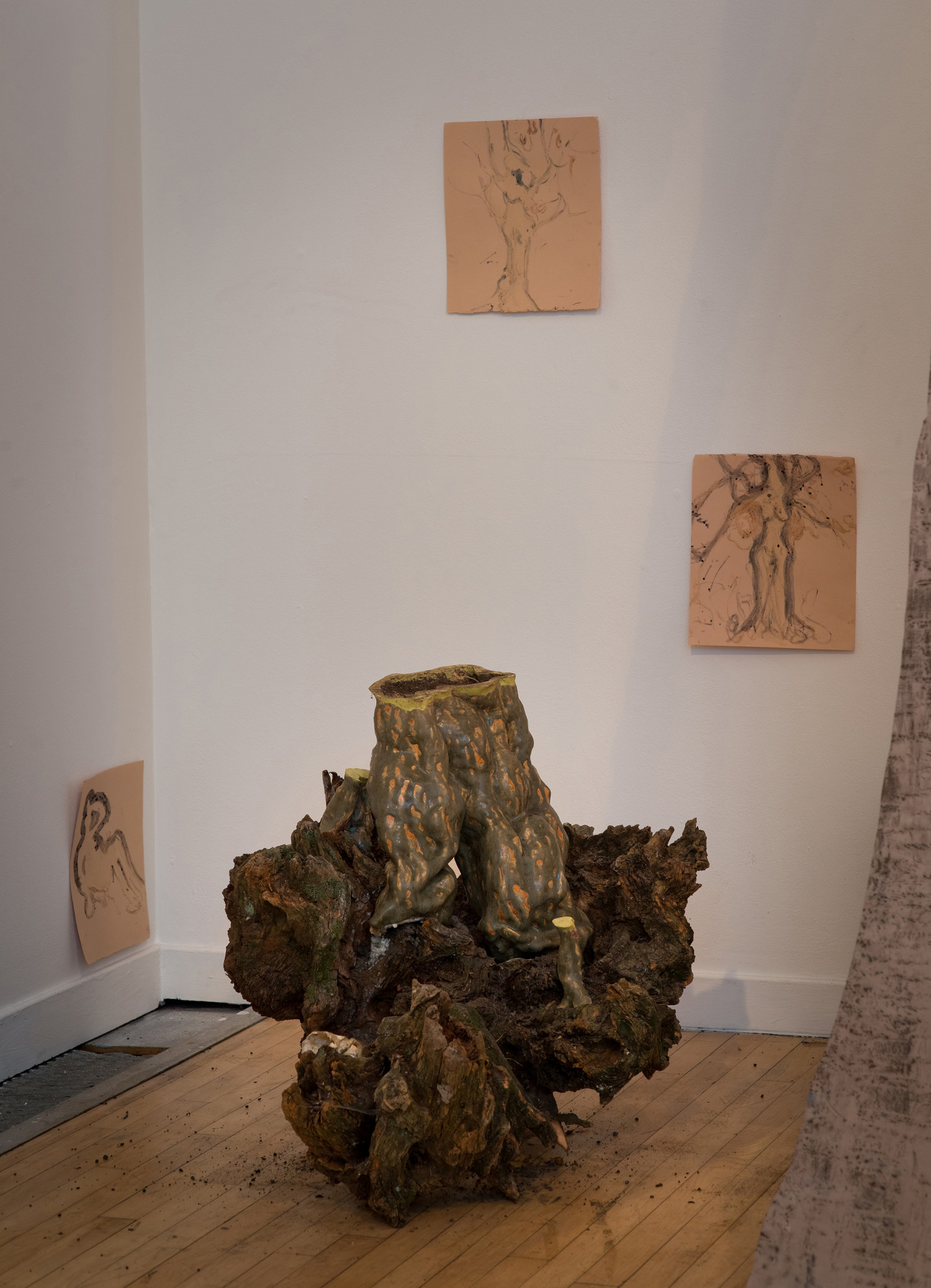 The photos and videos bring a little bit of the ‘real’ into the exhibition (and are used sparingly as the real is a tricky business). I am interested in the marks made and the traces left by all the living beings that use this wood, humans included. I think of myself as acting alongside these other creatures: making, building and drawing in the landscape. There is quite a lot of human rubbish too, bottles, cans, packets and the like. I couldn’t bring myself to include photographs of that here, as it’s just too depressing, and you know all too well what it looks like, it’s everywhere.