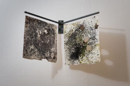 The smaller brackets hang Snaketrap Drawings. The paper had graphite and King Alfred’s Cake, a dry blackish kind of bracket fungus, which produces good pigment when it spores, grated onto it before I hid them under snaketraps (squares of metal or carpet that wildlife enthusiasts use to entice snakes to warm up under so they can count, not catch, them) on the nature reserve. I can’t promise that the snakes made the marks you see, but slowworms definitely enjoy using these places, I’ve seen them several times. And I’ve seen grass snakes, but never yet the adders for which the nature reserve is famed. I fear slugs may be responsible for the holes though. Enormous, orange slugs.